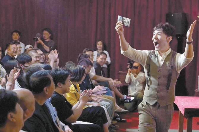 鄧男子(右)在觀眾面前展示近景魔術(shù)。記者 方非 攝
