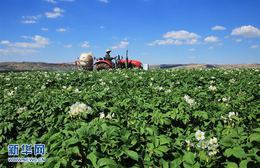 7月19日,在甘肅省定西市安定區(qū)香泉鎮(zhèn)馬鈴薯種植基地,農(nóng)民在進(jìn)行馬鈴薯田間管理。