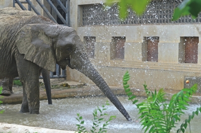 在大象展區(qū),寬敞的運(yùn)動場地上,淋浴噴頭頗為顯眼,下方還有一個半米多深的水池,天氣熱的時(shí)候,大象可以邊淋浴邊戲水,時(shí)不時(shí)甩開長鼻子吸起水來為自己沖涼。運(yùn)動場上還有兩個七八米高的草棚,沖完涼的大象可以躺在下面乘涼休息。