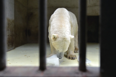 這時(shí),飼養(yǎng)員向北極熊的“客廳”投進(jìn)去兩大塊冷凍冰塊,不一會兒,一只胖胖的北極熊挪動著龐大的身軀慢慢地從自己“臥室”走出來,雙手抱起冰塊,放在嘴邊啃起來。