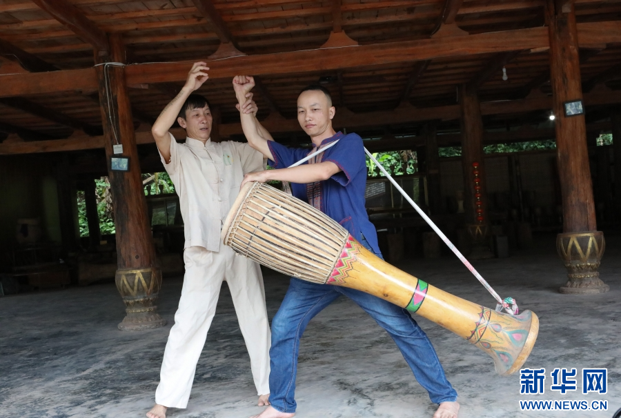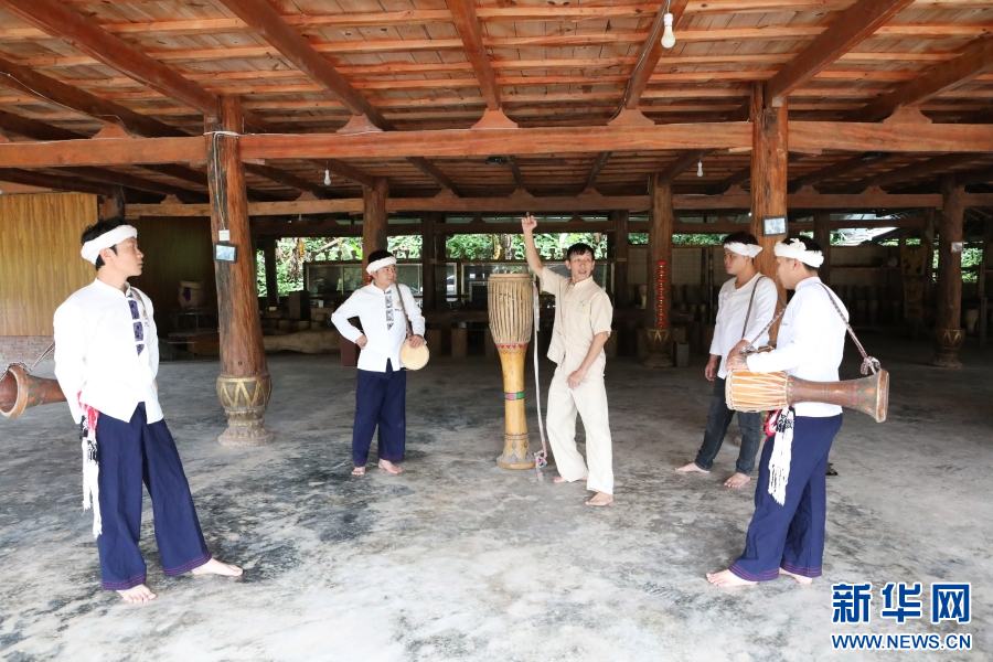 8月16日,波罕丙(右一)帶領(lǐng)徒弟練習(xí)象腳鼓舞。新華網(wǎng)發(fā)(李云生 攝)
