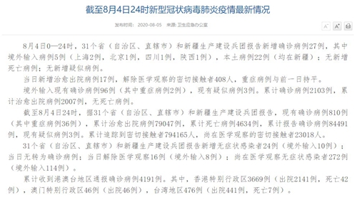 情況顯示,截至8月4日24時,據(jù)31個?。ㄗ灾螀^(qū)、直轄市)和新疆生產(chǎn)建設兵團報告,現(xiàn)有確診病例810例(其中重癥病例36例),累計治愈出院病例79047例,累計死亡病例4634例,累計報告確診病例84491例,現(xiàn)有疑似病例3例。累計追蹤到密切接觸者794165人,尚在醫(yī)學觀察的密切接觸者23018人。