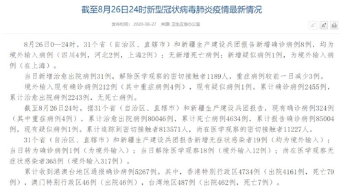 情況顯示,截至8月26日24時,據(jù)31個省(自治區(qū)、直轄市)和新疆生產(chǎn)建設(shè)兵團報告,現(xiàn)有確診病例324例(其中重癥病例4例),累計治愈出院病例80046例,累計死亡病例4634例,累計報告確診病例85004例,現(xiàn)有疑似病例1例。累計追蹤到密切接觸者813571人,尚在醫(yī)學(xué)觀察的密切接觸者11227人。