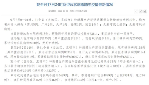 情況顯示,截至9月7日24時,據(jù)31個省(自治區(qū)、直轄市)和新疆生產(chǎn)建設(shè)兵團(tuán)報告,現(xiàn)有確診病例175例(其中重癥病例2例),累計(jì)治愈出院病例80335例,累計(jì)死亡病例4634例,累計(jì)報告確診病例85144例,現(xiàn)有疑似病例1例。累計(jì)追蹤到密切接觸者820007人,尚在醫(yī)學(xué)觀察的密切接觸者6552人。