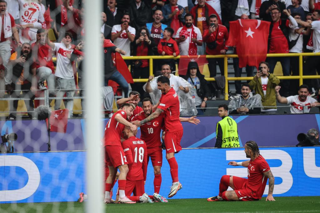 6月18日,土耳其隊(duì)球員梅爾特·穆爾杜爾(18號(hào))進(jìn)球后與隊(duì)友慶祝。新華社記者 潘昱龍 攝
