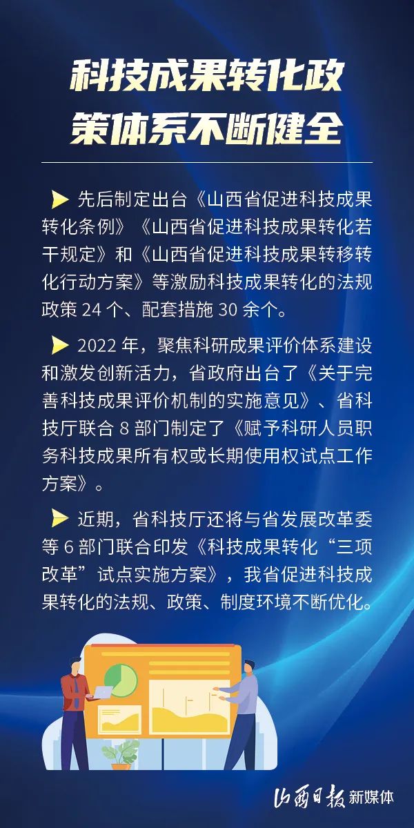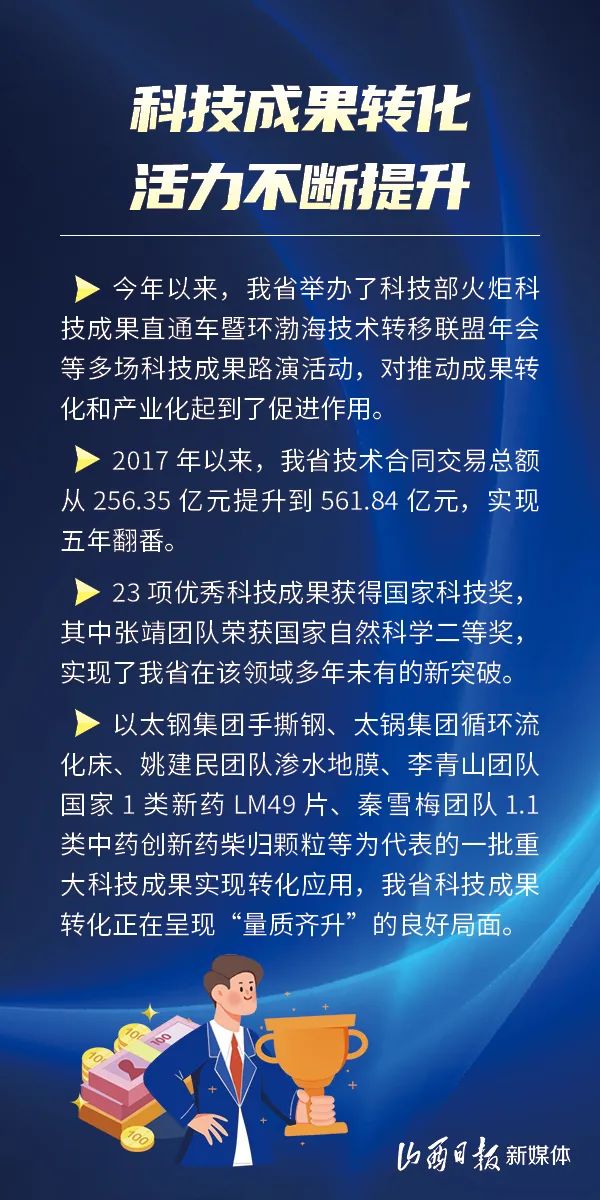 制定出臺(tái)激勵(lì)科技成果轉(zhuǎn)化法規(guī)政策24個(gè)、技術(shù)合同交易總額實(shí)現(xiàn)五年翻番、科技成果轉(zhuǎn)化引導(dǎo)專項(xiàng)五年累計(jì)投入2.21億元……近年來,我省科技成果轉(zhuǎn)化堅(jiān)持新發(fā)展理念,加速科技成果在晉落地轉(zhuǎn)化和產(chǎn)業(yè)化,取得顯著成效。