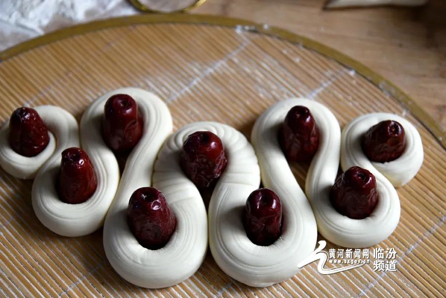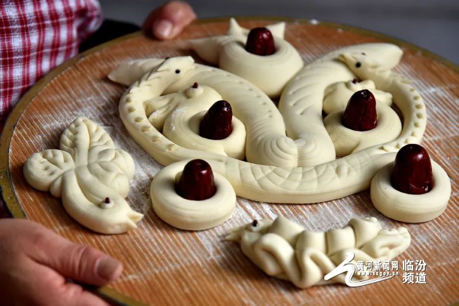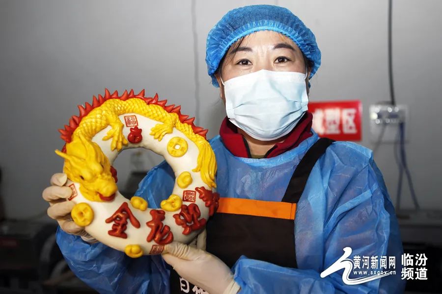 在晉南,蒸花饃是不可缺少的一項年俗?;x藝人用面粉、果蔬汁、雞蛋和牛奶等食材為原料,巧手捏制出“金龍迎春”“迎春納福”等寓意吉祥的系列花饃,為即將到來的龍年春節(jié)增添了濃濃的年味。