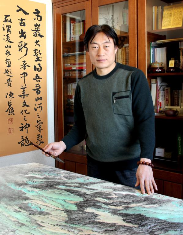 認(rèn)識殷渭凌,是先認(rèn)識他的畫,前幾年在一次省里畫展上看到了一幅山水畫,淳樸、厚重,樸實的親切、厚重的實在,完全沒有近幾年流行的風(fēng)氣,也沒有長期臨摹傳統(tǒng)繪畫形成的習(xí)氣。正如一個從鄉(xiāng)村走出來的小伙,健康、有朝氣、單純、樸實、憨厚、怯生生的站在那里,給我留下了很深的印象。因為忻州地區(qū)畫山水的人不多,很快就認(rèn)識了渭凌。果然人如其畫,淳樸、厚道、話不多、為人真誠,是個畫畫肯下功夫的小伙子。后來省美協(xié)山水畫藝委會的活動都有他的身影,畫越畫越多,畫的也越來越好,但是畫面中那種親切、樸實、厚重、蒼茫的特點卻一點兒也沒有丟失。濃濃的泥土氣息生發(fā)于筆墨中,散發(fā)在畫面里,在展廳里感染著每一個觀眾。晉西北風(fēng)情在他的營造下得到了充分的體現(xiàn)。